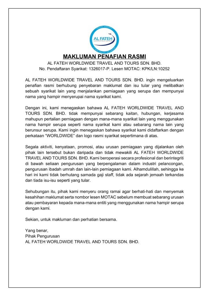“Layanan tiptop! Dari pendaftaran sampai balik Malaysia, staf Al Fateh Worldwide Travel and Tours sangat membantu dan profesional. InsyaAllah saya akan pergi lagi bersama mereka.”